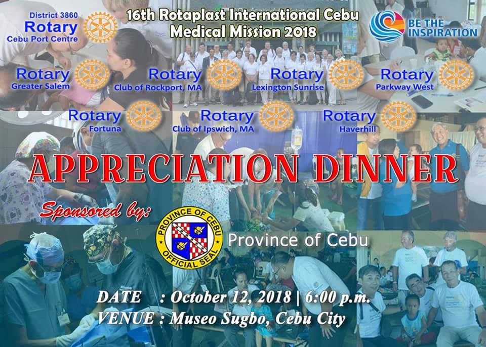 RC Cebu Port Centre, Sponsors and Partners would like to thank the Province of Cebu lead by Gov. Hilario Davide for sponsoring Appreciation Dinner for the Rotaplast 2018, Doctors, Nurses and Volunteers at Museo Sugbu tonight October 12, 2018. During … Read More →