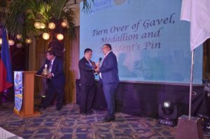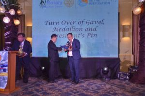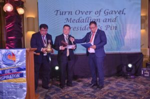 Outgoing Pres. Samson Tiu turn over the Gavel, Medallion and Pin to Incoming President Rodien Paca last 34th Induction of Officers and Turn Over Ceremonies held at Capiz Rm, Cebu Country Club